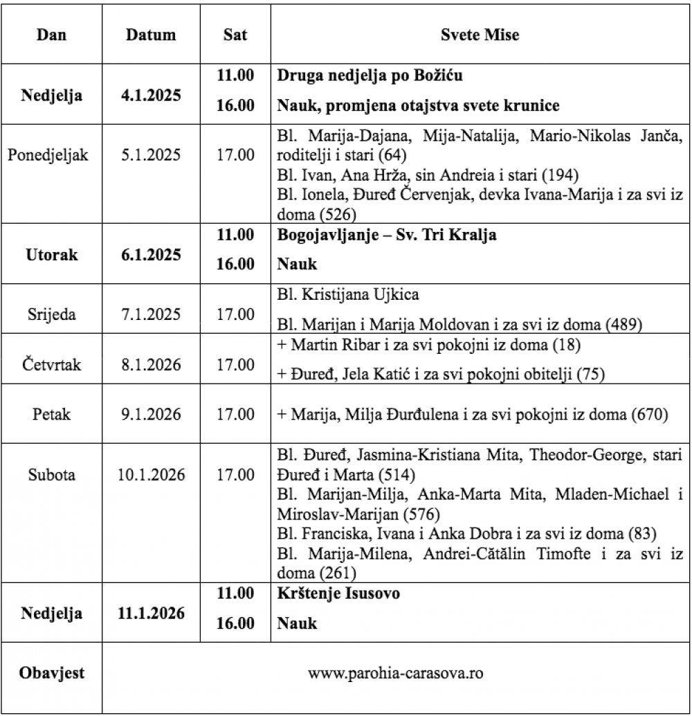Župa Uznesenja Blažene Djevice Marije iz Karaševa, raspored svetih misa od datuma 04.01.2026. do 11.01.2026.