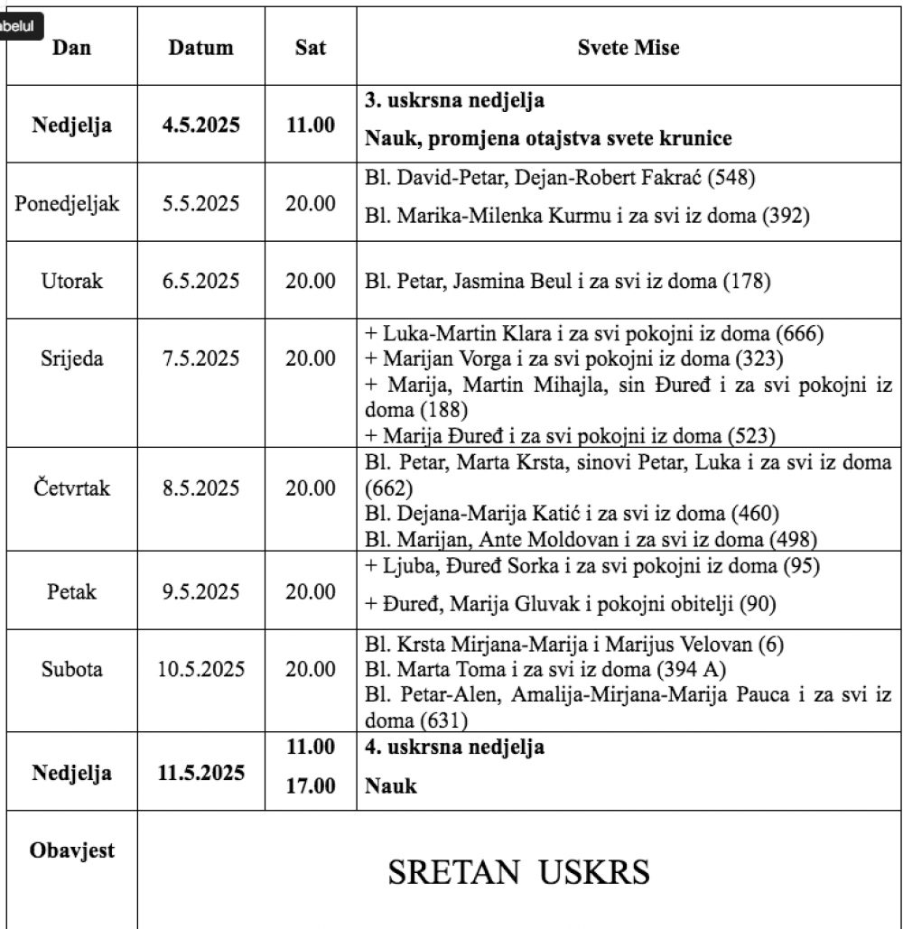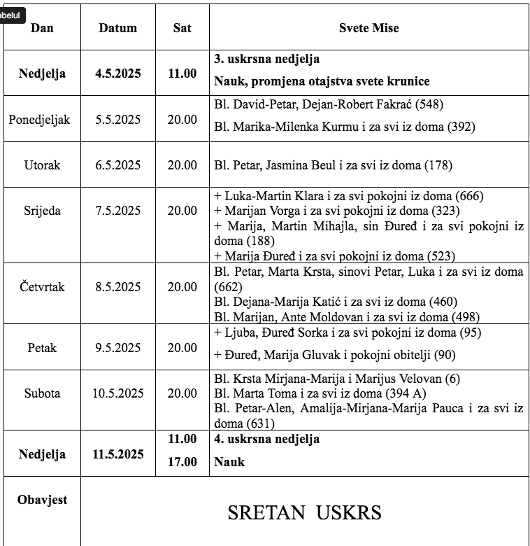 Župa Uznesenja Blažene Djevice Marije iz Karaševa, raspored svetih misa od datuma 04.05.2025. do 11.05.2025.