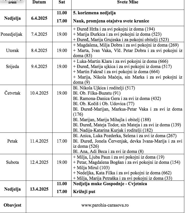 Župa Uznesenja Blažene Djevice Marije iz Karaševa, raspored svetih misa od datuma 06.04.2025. do 13.04.2025.