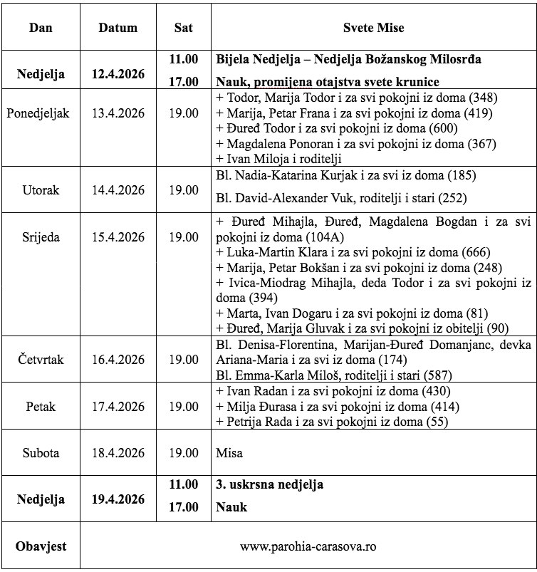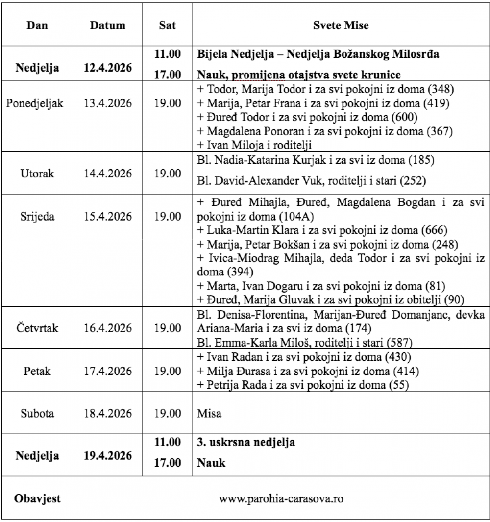 Župa Uznesenja Blažene Djevice Marije iz Karaševa, raspored svetih misa od datuma 12.04.2026. do 19.04.2026.