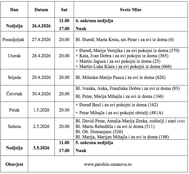 Župa Uznesenja Blažene Djevice Marije iz Karaševa, raspored svetih misa od datuma 26.04.2026. do 03.05.2026.